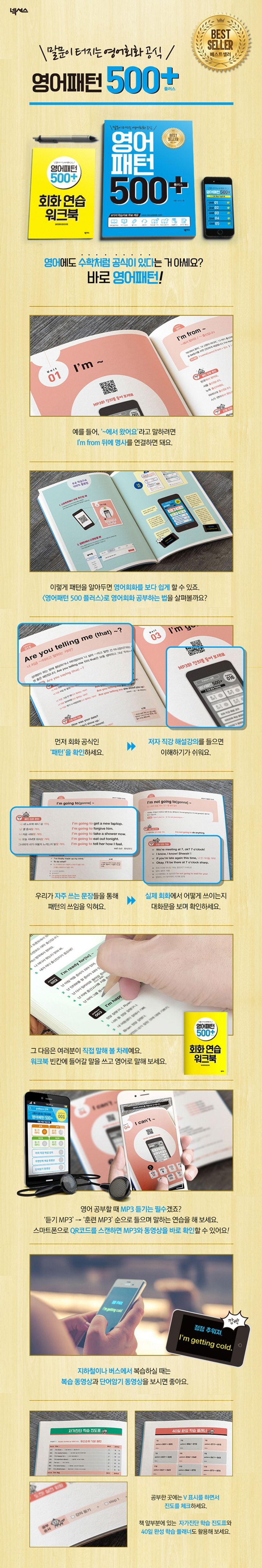 영어 패턴을 알고 있으면 단어/표현만 바꿔넣어 하고 싶은 말을 쉽게 할 수 있다. 『영어패턴 500 플러스 +』은 서울대학교에서 영어교육학을 전공하고 우리나라의 전통적인 영어 학습법을 통해 영어를 배운 아빠와, 어려서부터 영어권 국가에서 영어를 습득한 이중언어 구사자인 딸이 함께 쓴 책이다. 현지인들이 일상 대화에서 실제로 많이 쓰는 패터 200개를 엄선하고, 상황에 따라 응용할 수 있는 유사 패턴 300여 개도 함께 수록했다.