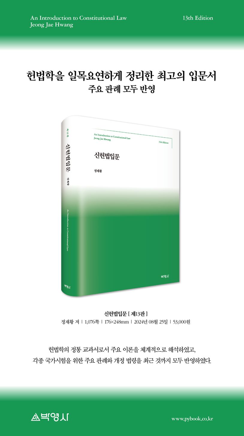정부조직법 등 헌법부속법령의 개정, 재외동포기본법과 같은 신법 시행, 헌법판례 집적 등을 반영한 제13판이다. 각종 국가시험에서 판례를 묻는 문제들이 많이 출제되어 중요 판례를 빠트리지 않고 수록하였다. 판례는 2024년 6월에 나온 것들까지를 분석하여 실었다.