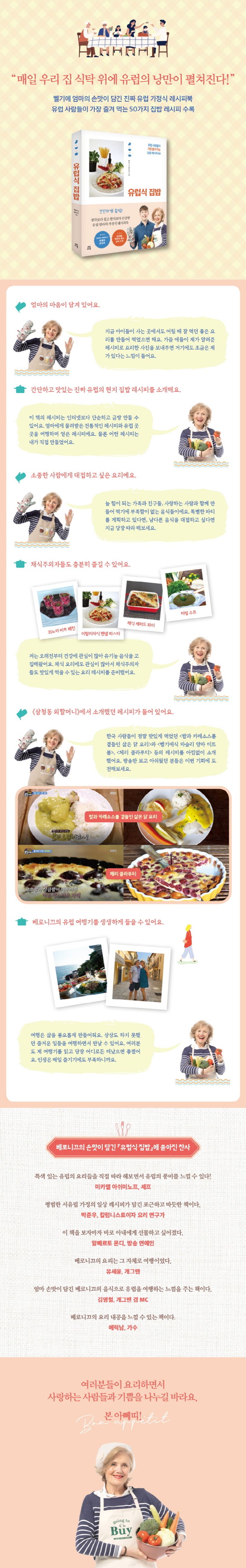 한국에서 활동하고 있는 방송인 줄리안 퀸타르트의 어머니로 알려진 베로니끄 퀸타르트가 직접 이탈리아, 스페인, 프랑스 등 유럽 곳곳을 여행하면서 전통시장의 상인이나 레스토랑의 주방장 등으로부터 얻은 유럽 사람들의 음식 문화와 현지 레시피를 생생하게 담아낸 『유럽식 집밥』. 유럽 사람들이 실제 집밥으로 만들어 먹는 다양한 요리 가운데 한국인의 입맛에 맞는 레시피만을 엄선해 애피타이저부터 전채 요리, 메인 요리, 수프 요리, 후식 등 다양한 종류의 요리를 담았다.