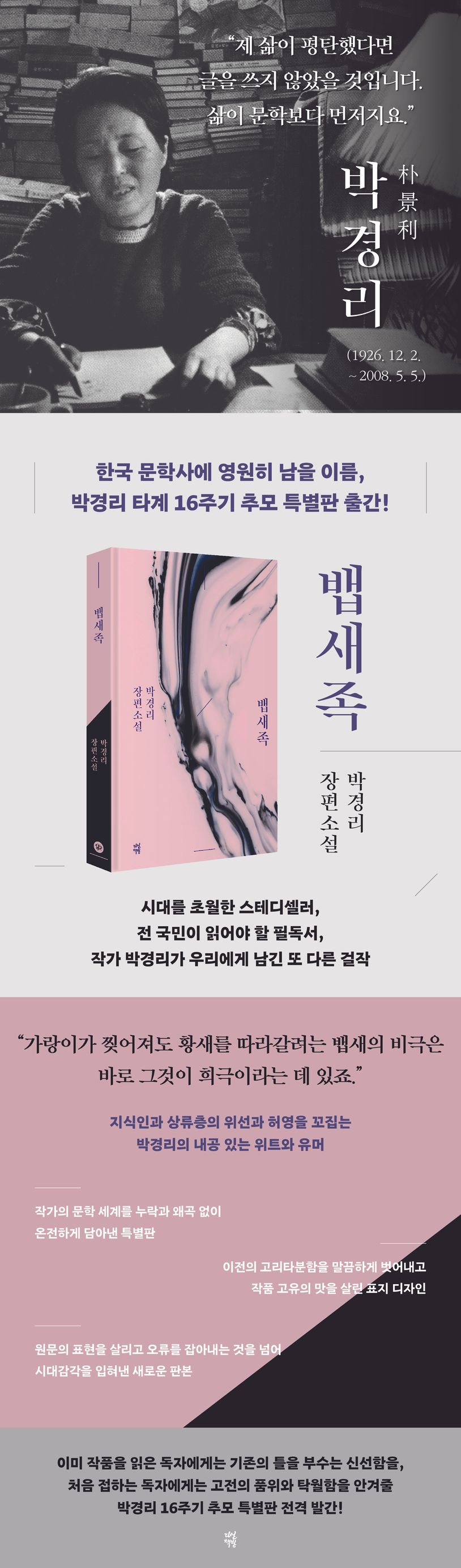 다산북스에서새롭게출간된『뱁새족』은박경리의또다른걸작이다.이작품은1967년6월16일부터9월11일까지《중앙일보》에약3개월간연재(총75회)되었으며,이후단행본으로출간되었다.