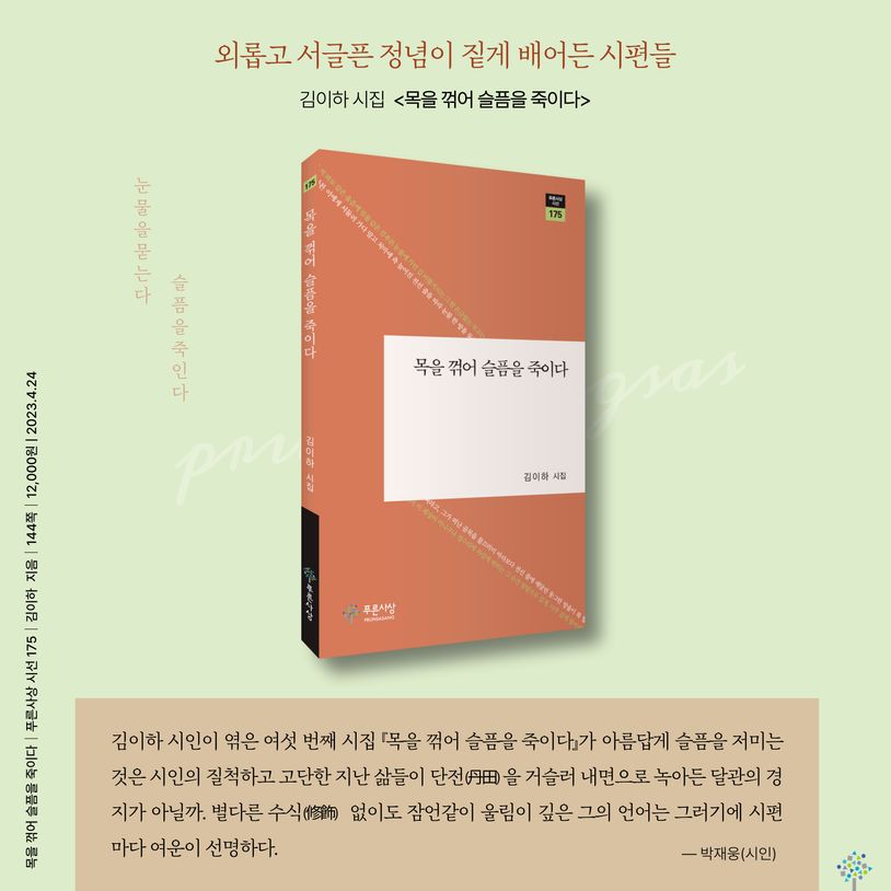 김이하 시인의 여섯 번째 시집 『목을 꺾어 슬픔을 죽이다』가 〈푸른사상 시선 175〉로 출간되었다. 시인은 고독과 처연한 슬픔을 특유의 낙천적인 힘으로 견뎌내면서 우리 시대 민중들의 삶의 질곡을 기록하고 있다. 서글픈 정념과 애수가 짙게 밴 시편들은 독자들에게 진한 감동과 여운을 남긴다.