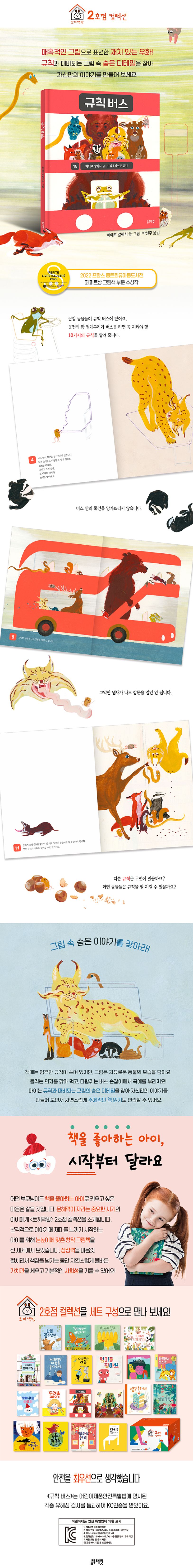 2022 프랑스 몽트뢰유아동도서전 페피트상 그림책 부문 수상작, 《규칙 버스》는 글과 그림이 서로 맞지 않는 그림책이에요. 글로는 딱딱하고 엄격하게 규칙이 쓰여 있지만, 그림은 자유로운 동물의 모습을 담아서 더욱 재미있지요! 버스 안의 물건을 망가뜨리지 말라고 써 놓았지만 하지만 들쥐는 의자를 갉아 먹고, 버스 안에서 달리면 안 된다고 하지만 사슴과 토끼는 열심히 달려요. 규칙 버스에서 규칙과는 다른 어떤 일이 벌어지고 있는지 그림의 숨은 디테일을 찾아보세요. 또 그림을 보며 아이 스스로 자신만의 이야기를 만들어 보기도 하면서 자연스럽게 주체적인 책 읽기도 연습할 수 있어요.