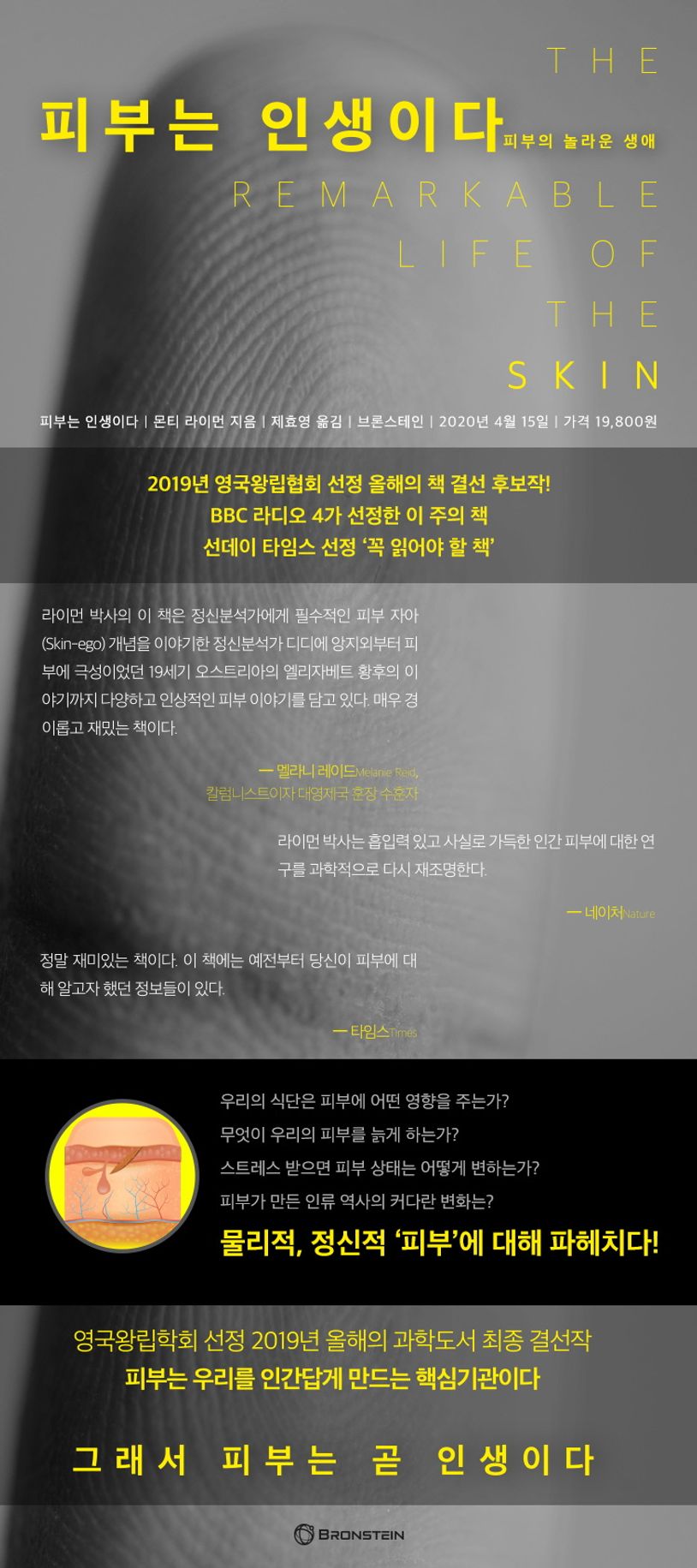정교하고 복잡한 육체를 감싼 조직, 피부는 몸에서 가장 넓고 빨리 재생되는 신체 기관이다. 우리는 매일 같이 피부 안에서 피부를 보고 만지며 살아간다. 피부는 놀랍도록 복잡한 미생물이 살아가는 서식지이자 우리 건강과 생존은 물론 정체성 발현에도 관여하는 필수 기관이다. 하지만 피부에 대해 우리가 아는 바는 극히 미미하다. 피부과학과 의학분야 저술로 여러 차례 수상한 몬티 라이먼 박사는 우리를 과학, 사회, 역사적 관점에서 신세 기관 중 가장 저평가 받는 기관인 피부의 놀라운 생애에 관한 탐험으로 독자를 이끈다.