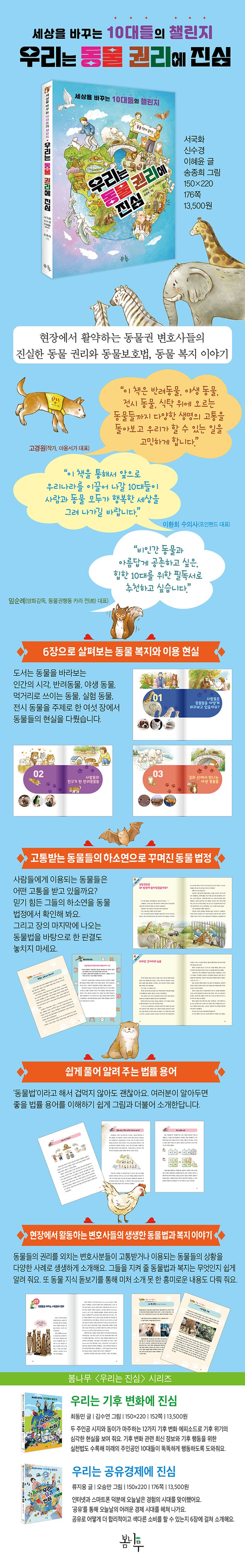 1장부터6장에걸쳐주제에맞는동물권과복지,생명존중의이야기가챕터별로풍부하게다뤄집니다.실제로변호사세분이변호한동물사건과권리및복지를위해활약한활동은물론,지금껏사람들이알지못한동물권의내용과그범위를생생하게들려줘요.어려운법률용어이해도문제없어요.글에나오는중요한법률용어를쉽게풀어쓰고한눈에들어오는삽화로이해를돕는답니다.동물보호법을바탕으로풀어진이야기들에는사람들이무심코했던행동가운데무엇이불법이고,합법인지인지도알수있어요.왜사람들이동물과더불어살아가야하는지,왜생명을존중해야하는지답을알수있어요.동물권지식을하나하나알아가는동안,독자여러분에게동물을보호하고싶은마음이싹틀거예요.