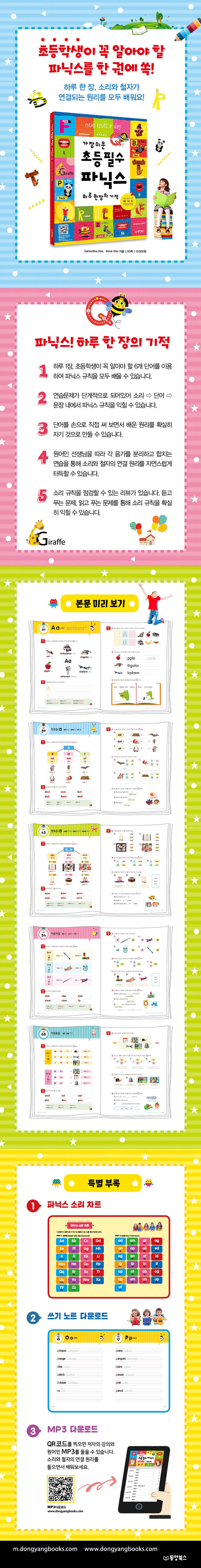 파닉스는하루아침에이루어지지않습니다.매일매일소량을가지고꾸준히반복하여소리와철자를귀로,눈으로익히는습관을들여보세요.곧영어로된글을유창하게읽는자신의모습을보게될것입니다.