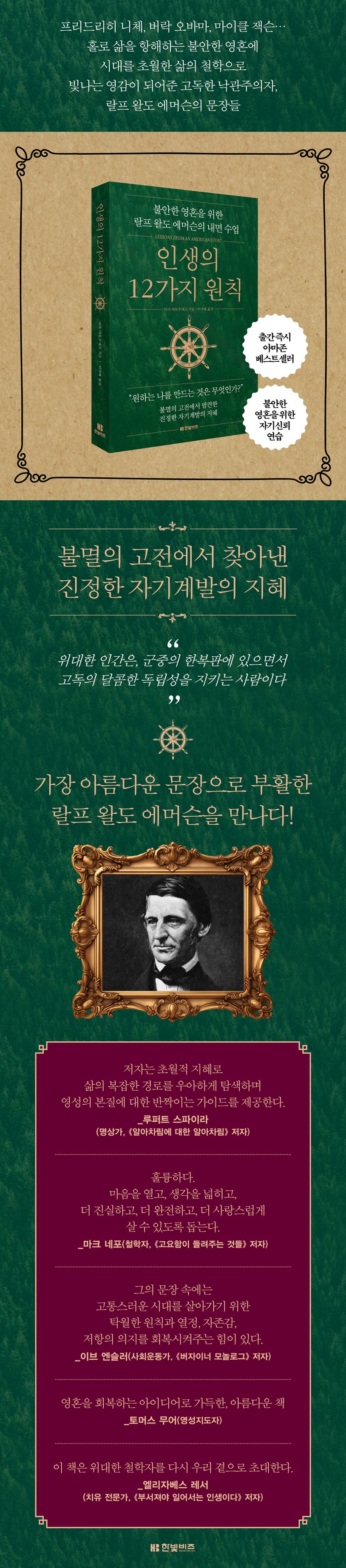 프리드리히 니체, 버락 오바마, 마이클 잭슨이 그랬던 것처럼, 불안과 고립의 시대를 홀로 항해하고 있는 지금 우리에게도 에머슨이 필요하다. 《자기신뢰》와 《자연》을 포함한 12권의 저작과 에세이 4편, 40여 년간 지속했던 1,400회가 넘는 대중 강연에서 그가 쓰고 말한 문장들을 새로운 해석과 함께 담은 《인생의 12가지 원칙》은 우리가 잊고 지낸 고독의 기쁨과 우리가 손수 그림자 속에 가뒀던 거인, 즉 ‘원하는 나’를 깨우는 200여 년의 지혜를 우리에게 돌려줄 것이다.