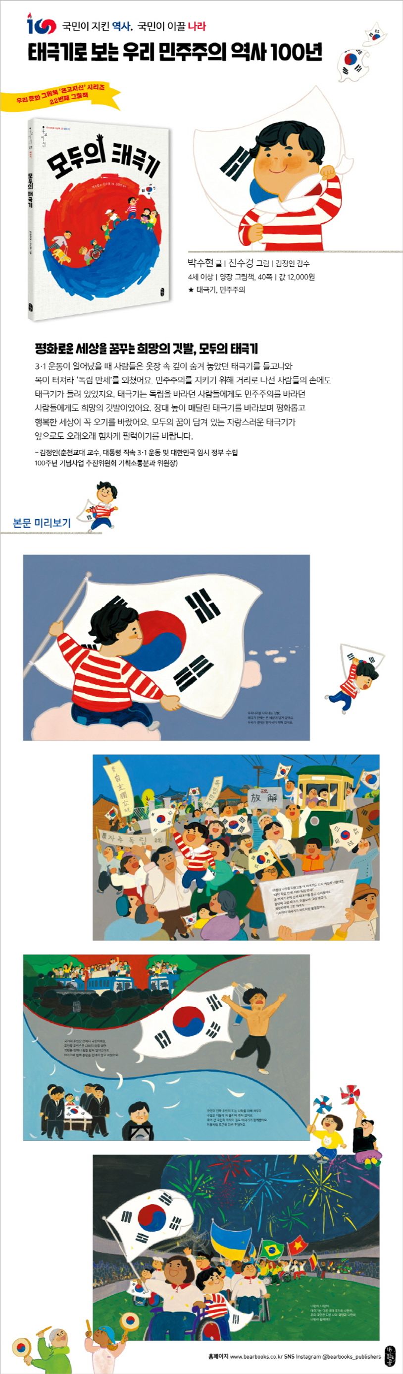 3ㆍ1 운동이 일어났을 때 사람들은 옷장 속 깊이 숨겨 놓았던 태극기를 들고나와 목이 터져라 ‘독립 만세’를 외쳤어요. 민주주의를 지키기 위해 거리로 나선 사람들의 손에도 태극기가 들려 있었지요. 태극기는 독립을 바라던 사람들에게도 민주주의를 바라던 사람들에게도 희망의 깃발이었어요. 장대 높이 매달린 태극기를 바라보며 평화롭고 행복한 세상이 꼭 오기를 바랐어요. 모두의 꿈이 담겨 있는 자랑스러운 태극기가 앞으로도 오래오래 힘차게 펄럭이기를 바랍니다.