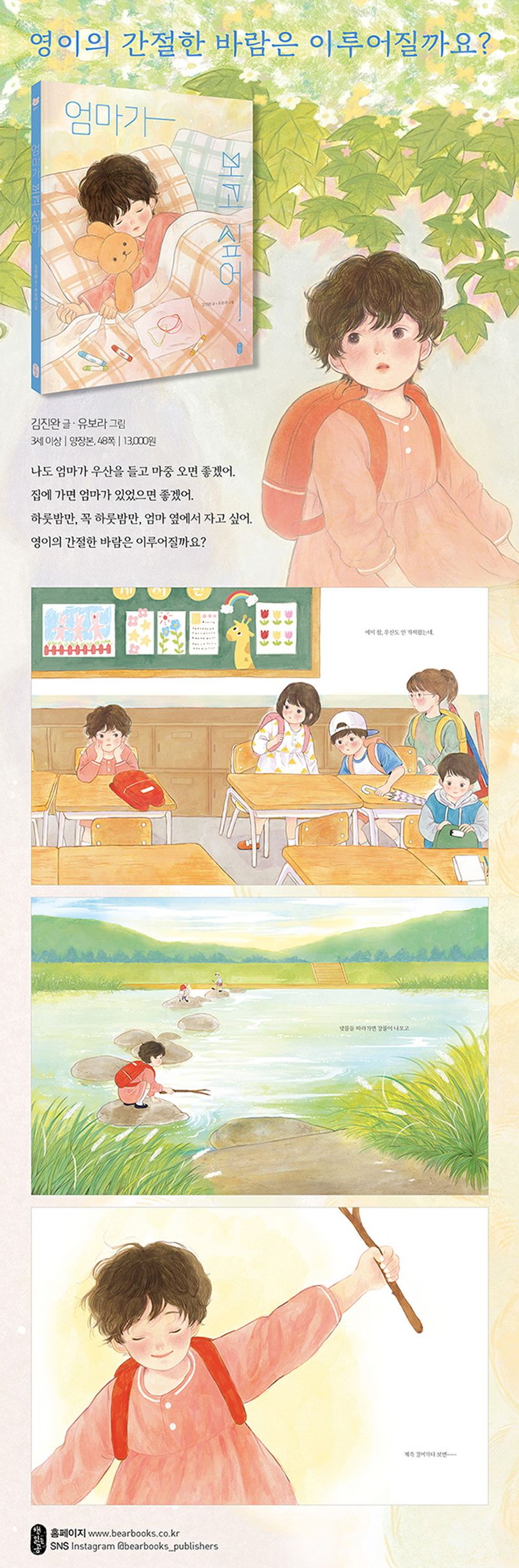영이는 엄마와 떨어져 할머니 댁에서 삽니다. 할머니는 농사일로 바빠서, 학교에서 돌아오면 혼자 집에 있을 때가 많습니다. 영이도 비가 오면 엄마가 우산을 들고 마중 오면 좋겠습니다. 집에 가면 엄마가 있으면 좋겠고, 하룻밤만이라도 엄마와 소곤소곤 이야기를 나누다가 엄마 품에서 잠들고 싶습니다. 엄마가 보고 싶은 아이의 애틋한 마음을 담은, 한 편의 시처럼 서정적인 그림책입니다.
