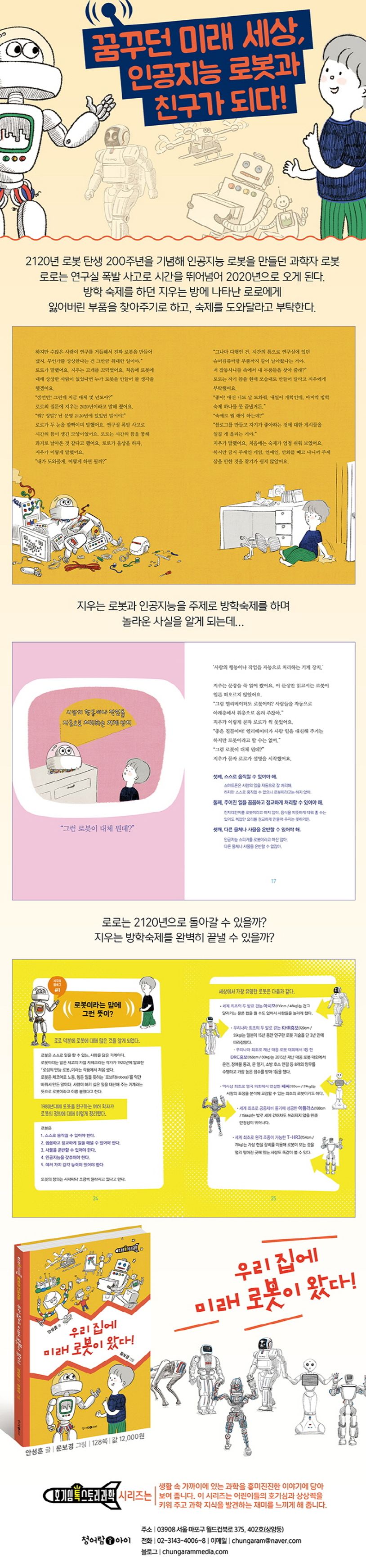 1부 로봇, 2부 인공지능으로 나누어 로봇의 구조와 종류, 로봇을 발전시킨 과학자부터 인공지능 역사, 인공지능 로봇의 활용, 미래의 직업 변화까지 담았다. 우리 삶에 깊숙이 들어온 놀라운 과학 기술에 한 걸음 더 가까워질 수 있다.