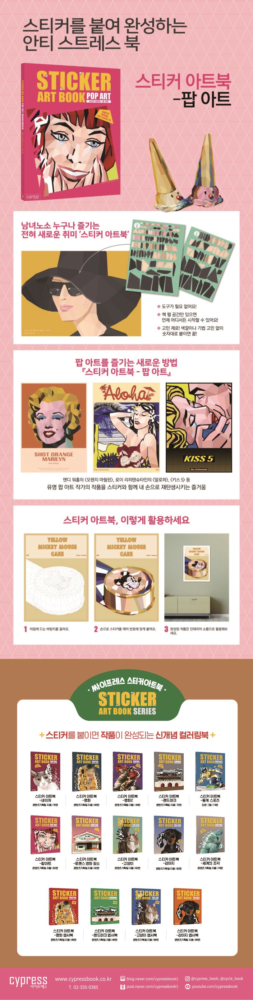스티커를 붙여 나만의 작품을 완성하는 스티커 액티비티 도서 『스티커 아트북』의 일곱 번째 책이 출간됐다. 이번 책은 출간 즉시 베스트셀러로 떠오른 『스티커 아트북-네이처』, 『스티커 아트북-명화』, 『스티커 아트북-명화2』, 『스티커 아트북-랜드마크』, 『스티커 아트북-동계 스포츠』, 『스티커 아트북-명화 엽서북』을 이은 『스티커 아트북-팝 아트』이다. 이 책 『스티커 아트북-팝 아트』에서는 앤디 워홀의 [오렌지 마릴린], 로이 리히텐슈타인의 [행복한 눈물], [알로하] 등 유명 작가들의 팝 아트 작품 10가지를 한데 모았다.