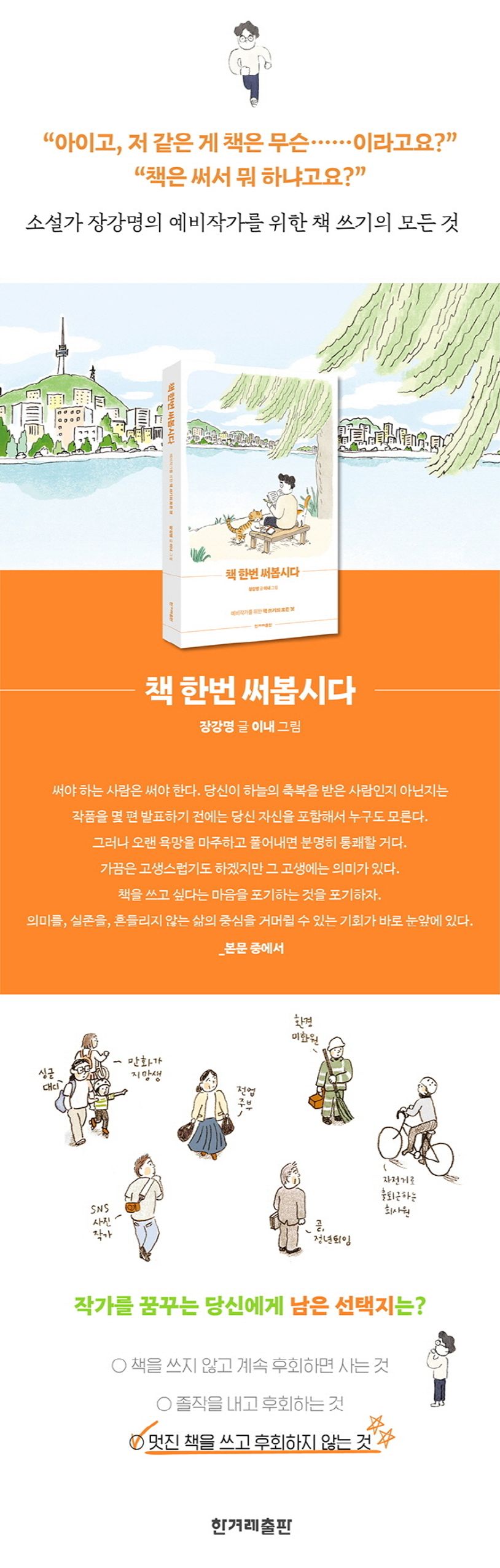 장강명 작가에게 ‘책’이란 ‘미래’와 동의어다. 그리고 작가는 ‘책이 중심이 되는 미래’를 꿈꾼다. 다만, 미래는 저절로 다가오는 것이 아니기에, 미래는 우리가 선택하고 만드는 것이기에, 책을 읽고 책을 쓰며 ‘책이 중심이 되는 미래’를 만들자고 말한다. 그게 정말 쉬운 일은 아니기에 ‘책 한번 써봅시다’라고 예비작가들을 향해 선언하고, 부탁하고, 속삭인다. 작가는 이 책이 그 물꼬가 되기를 바란다. 많은 사람들이 책을 쓰는 즐거움과 감동을 느끼고, 책 쓰기가 우리 사회에 아주 이롭다는 것을 알아주길 바란다. 《책 한번 써봅시다》는 그런 마음이 그득그득 담긴 책이다.