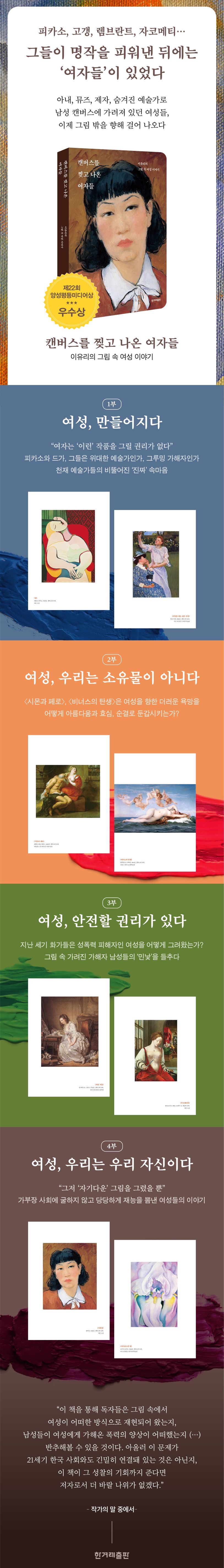 《화가의 마지막 그림》 《세상을 바꾼 예술 작품들》 《화가의 출세작》 등을 집필한 이유리 작가의 신작이 출간됐다. 전작에서 화가와 그림에 관한 ‘숨은’ 이야기를 들려주며 독자의 사랑을 받아온 작가는 이번 책 《캔버스를 찢고 나온 여자들》에서 남성 캔버스에 ‘가려졌던’ 여성들의 이야기를 풀어냈다. 피카소, 고갱, 렘브란트, 자코메티 등 세기의 예술가들이 명작을 피워내기까지 그 뒤에서 큰 역할을 한 여성들을 비롯해 판위량, 매리 커샛, 베르트 모리조 등 뛰어난 재능을 가졌음에도 제대로 평가받지 못한 여성 예술가들의 이야기를 담았다. 아내, 뮤즈, 예술가이기 전 이들 여성은 가부장 사회를 받치는 ‘밑돌’로서 늘 고통받아왔다. 작가는 남성 중심 사회가 모른 척했던 여성을 향한 폭력 역시 이 책을 통해 폭로하고자 한다. 《캔버스를 찢고 나온 여자들》은 여성의 고통을 예술로 둔갑시킨 시대에 대한 고발이자 그림 속 여성에 관한 작가의 해석이 ‘낯섦’과 ‘신선함’이 아닌 ‘옳음’이었음을 밝히는 과정이다.