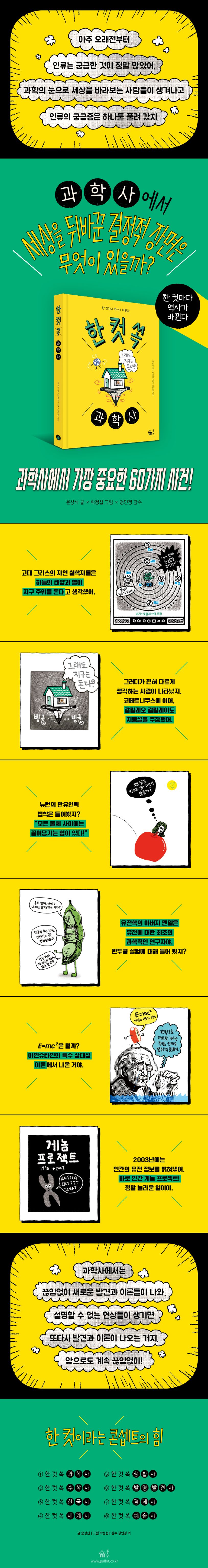 《한컷쏙과학사》는과학의발전과정에서발생하는일련의사건을시간순서에따라나열해보여준다.뉴턴의발견과같은과학적인사건을시대상과함께역사적인시각으로보여주는식이다.
