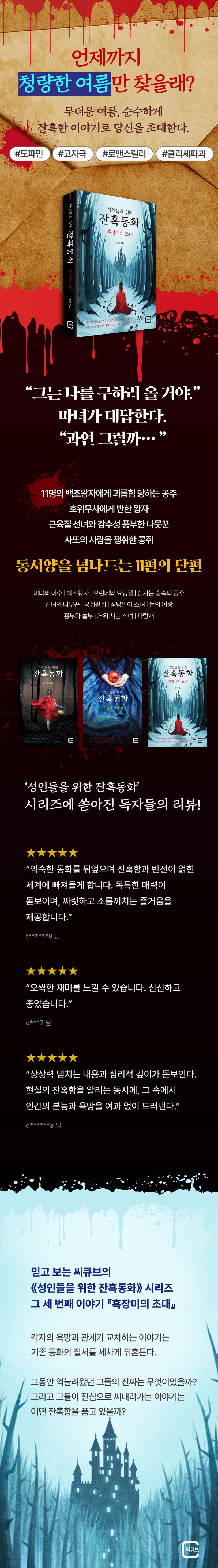 믿고 보는 씨큐브의 《성인들을 위한 잔혹동화》 시리즈, 그 세 번째 이야기 『흑장미의 초대』 이번 책에는 동양과 서양을 넘나드는 11편의 단편이 수록되었으며, 모두가 알던 동화를 낯설게 뒤틀고 욕망을 있는 그대로 드러낸다.