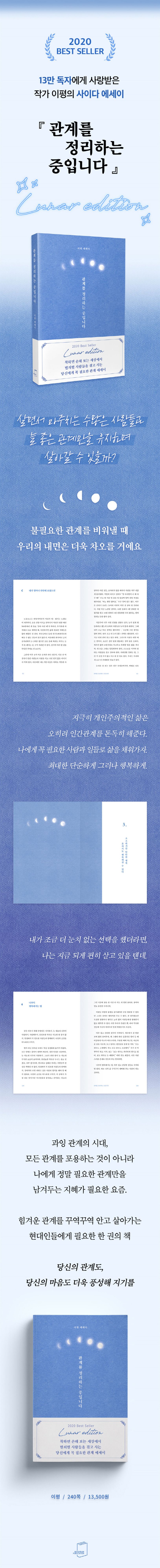 우리의 머릿속을 복잡하게 만드는 ‘관계’에 관한 문제를 속 시원히 정리해 주고, 나아가 나를 돌아보게 만드는 글로 독자들에게 공감과 애정을 이끌어낸 책 〈관계를 정리하는 중입니다〉가 21년 새로운 에디션으로 출간되었다. 파트를 넘길수록 점점 차오르는 달이 눈에 띄는 이번 루나 에디션은 불필요한 관계를 비워낼 때 우리의 내면은 더욱 단단하게 차오를 것이라는 의미가 담겨있다.