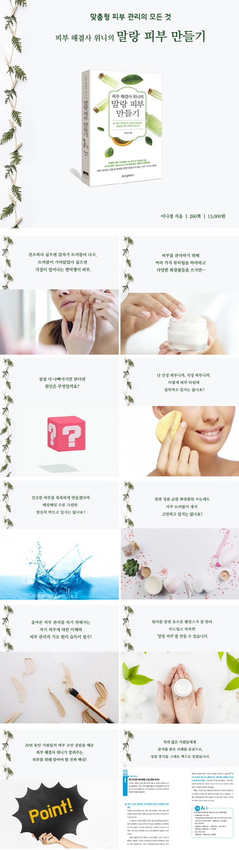 피부를 1년 내내 좋게 유지하기는 쉽지 않다. 겨울에는 건조한 칼바람, 여름에는 습한 찜통더위, 거기에 미세먼지까지 덮치며 피부를 못살게 굴기 때문이다. 좋은 피부란 유수분 밸런스가 잘 맞아 부드럽고 촉촉한 ‘말랑 피부’. 이런 환경에서 항상 말랑 피부를 유지하기 위해서는 자기 피부에 대한 이해와 피부 관리의 기초 원리 습득이 필수다. 그러나 많은 사람들이 자기 피부에 대한 이해 없이 인터넷이나 텔레비전의 단편적인 뷰티 정보를 무작정 따라 하다가 도리어 피부를 망치고 있다. 이 책은 20년간 피부 상담 웹사이트와 에스테틱을 운영하며 화장품 기획자, 교육자, 뷰티 칼럼니스트로 활동한 저자가 수많은 사람들의 피부 고민을 상담해주던 중 특히 많은 사람들에게 자주 문의를 받는 사례, 건강한 피부를 유지하기 위해 꼭 알아야 하는 관리의 기초 지식과 원리 원칙을 평소 하는 상담 방식을 살려 Q&A 형식으로 구성했다.