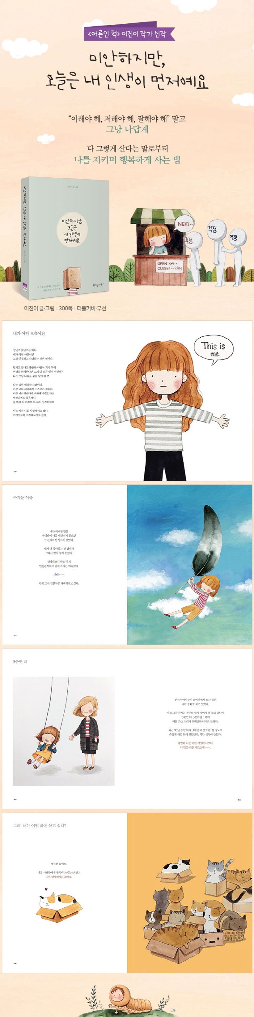 10만 독자에게 따스한 위로와 감동을 전해준 『어른인 척』 이진이 작가의 신작. ‘나는 어떤 사람일까?’ ‘나는 어떻게 살라고 나로 태어난 걸까?’를 매일 고민하는 이진이 작가는 특별하지 않은 하루에서 평범한 행복을 찾으려 애쓰며, 그래도 좋은 게, 예쁜 게 더 많은 세상에 감사한다. 하고 싶지 않은 것을 하지 않을 용기, 아무것도 하지 않아도 괜찮을 용기를 갖추기 위해 매일 분투하고, 누구나 그저 그런 어려운 인생을 살고 있지만 그럼에도 딱 오늘 하루만 잘 살아보기로 매 순간 약속한다. “너는 어떤 삶을 살고 싶니?”라고 누군가 물었을 때, 아무런 망설임 없이 “내가 행복한 삶이요.”라고 대답할 수 있도록. 그래서 “이래야 해, 저래야 해, 잘해야 해.”라고 끊임없이 재단하는 세상에 “미안하지만, 오늘은 내 인생이 먼저예요.”라고 당당히 말할 수 있도록.
