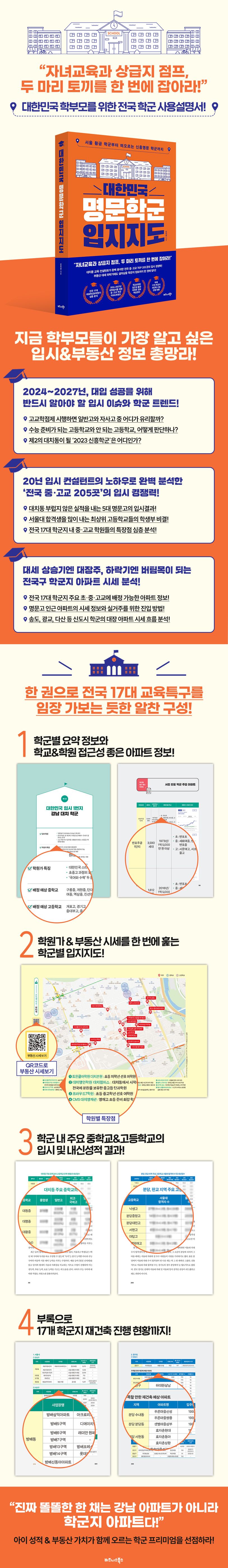 또한 이 책은 학군지 실거주를 고려하는 독자를 위해 부동산 매매와 전월세 실거래 이력을 바탕으로 학군 내 아파트와 주변 입지에 대한 정보를 구체적으로 분석해냈다. 주요 초・중・고 및 학원가와 인접한 블루칩 아파트(단지 규모가 크고 교통, 거주환경이 좋은 아파트)의 매매가와 전월세가 가격 추이 및 재건축 사업 진행 현황 등 투자 가치까지 제공한다. 《대한민국 명문학군 입지지도》는 자녀교육과 재테크, 두 마리 토끼를 다 잡을 수 있는 학군지 실거주를 위한 최적의 가이드북이 될 것이다.