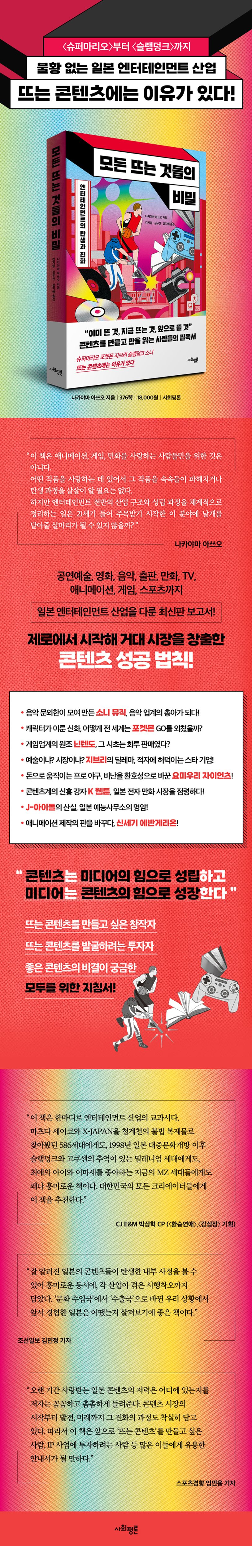『모든 뜨는 것들의 비밀』은 일본 엔터테인먼트 산업의 과거와 현재를 넘나들며, 일본이 어떻게 콘텐츠 강국이 될 수 있었는지 살피는 책이다. 저자는 이 책에서 10년 넘게 분석한 엔터테인먼트 산업의 원형과 현재, 미래의 전망을 들려준다. 엔터테인먼트 산업의 혁신은 어떻게 이뤄지는지, 엔터테인먼트 산업에 종사하는 사람들에게 콘텐츠는 어떤 의미인지, 나아가 콘텐츠가 사회를 어떻게 변화시키는지를 짚고 있다. 이 책은 뜨는 콘텐츠를 만들고 싶은 사람, IP 사업에 투자하려는 사람, 그 모두에게 유용하다. 콘텐츠 시장의 시작부터 발전, 미래까지 그 진화의 과정을 착실하게 담고 있다.
