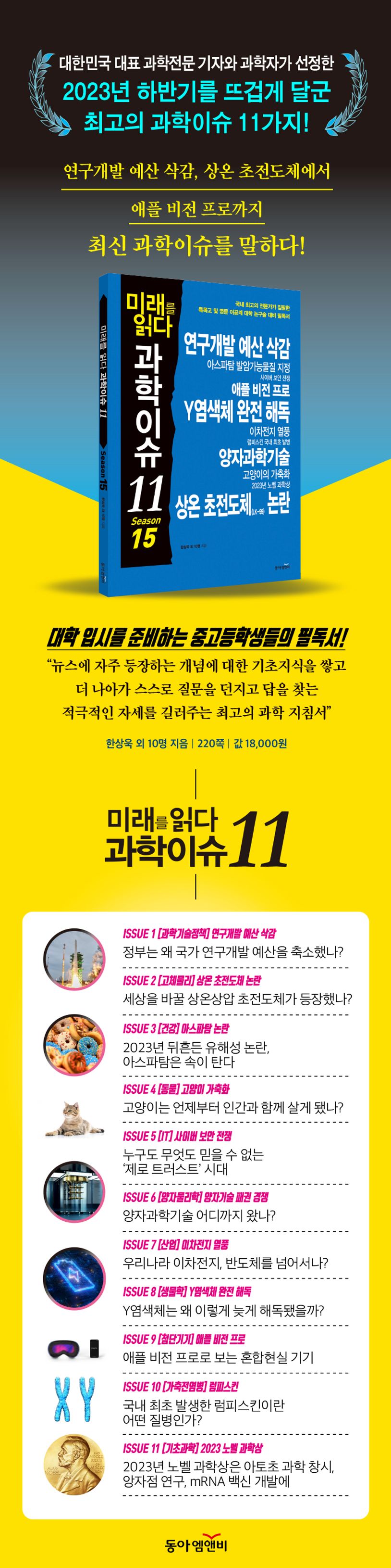 언론 매체나 포털 사이트 상위 검색어를 차지하는 첨예한 과학이슈들이 매일같이 쏟아져 나오는 현재, 과학기술의 성과와 중요성을 알리는 데 앞장서고 있는 전문가들의 명쾌한 해설을 한 권에 담은 《미래를 읽다 과학이슈 11 SEASON 15》! 우리나라 대표 과학 매체의 편집장 및 과학 전문기자, 과학 칼럼니스트, 관련 분야의 연구자들이 한자리에 모여 2023년 하반기 화제가 되어 주목받았던 과학기술 11가지를 선정했다.