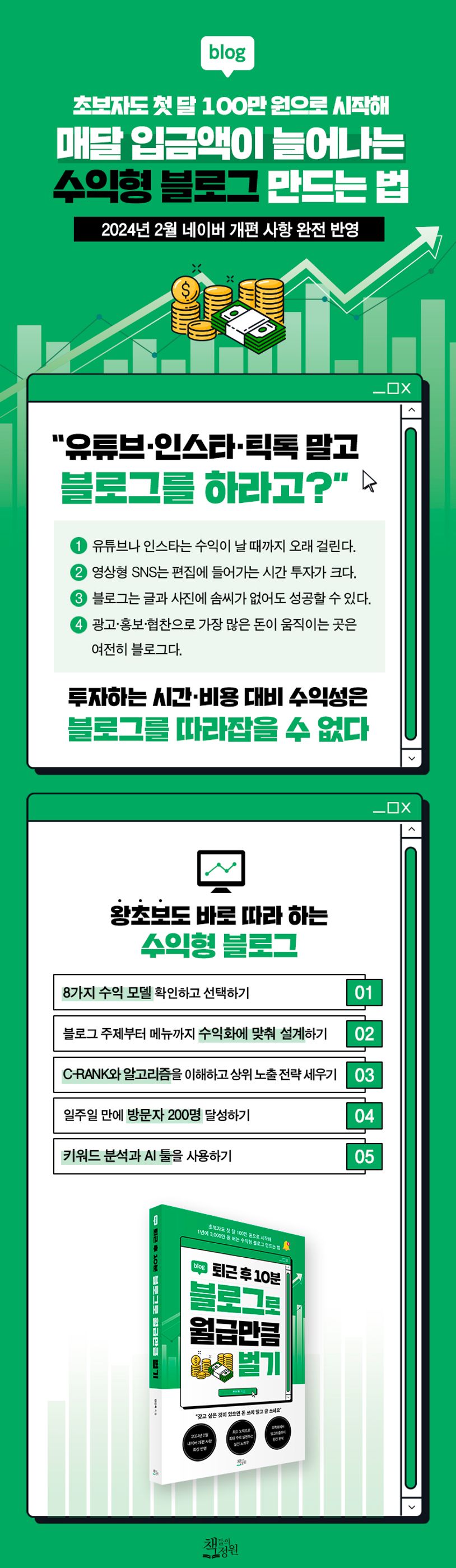 유튜브나 인스타그램·틱톡 등 영상 위주의 SNS가 인기라고 하지만 이런 채널은 수익이 날 때까지 기간이 너무 오래 걸리고 편집을 위해 써야 하는 시간 투자가 크다. 이에 반해 블로그는 직장인은 물론 육아맘이나 취준생 등이 가볍게 부업 삼아 시작할 수 있다. 블로그를 개설하고 무엇부터 해야 하는지 막막해하는 사람을 위해 저자는 블로그 시작 1년 만에 3,000만 원의 수익을 달성한 비법을 풀어 놓는다. 2024년 2월 네이버 개편 사항을 반영하고, 최적화 공식에서 알고리즘까지 완전 분석한 이 책은 당신을 새로운 길로 안내한다.