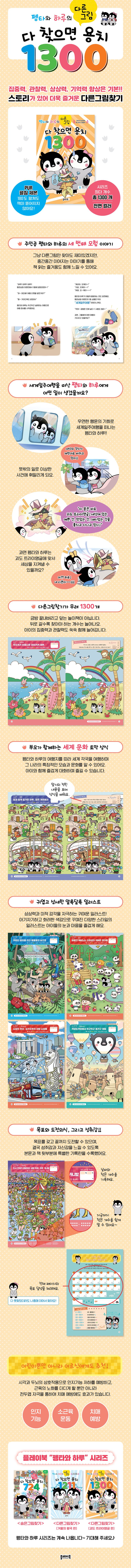 황제펭귄 펭타와 하루의 세 번째 모험을 다룬 다른그림찾기 놀이책. 다른 그림이 무려 1300개나 수록되어 있어 금방 끝내고 덮는 책이 아니다. 상상력과 미적 감각을 자극하는 아기자기하고 화려한 색감으로 꾸며진 일러스트는 눈과 마음을 즐겁게 해준다. 활동하는 동안 아이와 즐겁게 대화를 나눌 수 있는 풍성한 스토리가 곳곳에 녹여져 있다.