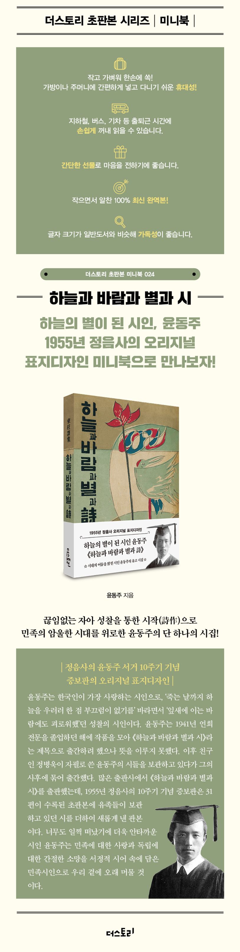 이번 더스토리에서 출간한 미니북 초판본 표지디자인《하늘과 바람과 별과 시》는 1955년 정음사의 윤동주 서거 10주기 기념 증보판의 오리지널 표지디자인을 그대로 차용해 제작했다. 본문은 독자들이 읽기 편하도록 한글맞춤법에 맞게 수정했지만 시의 의미가 훼손되지 않도록 원문을 최대한 살렸고, 간혹 지금은 사용하지 않는 단어나 어려운 한자어에는 독자들의 이해를 돕기 위해 각주를 달았다.