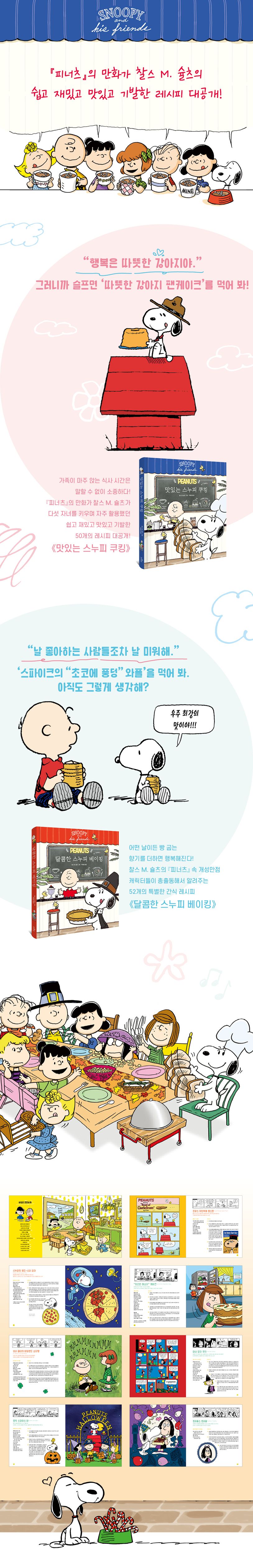 《달콤한 스누피 베이킹》은 찰스 M. 슐츠의 만화 『피너츠』 속 사랑스러운 캐릭터들이 총출동해서 52개의 간식 레시피를 소개한다. 누구나 좋아하는 대표적인 간식들을 선별해서 각 캐릭터의 개성대로 변형한 레시피들을 담은 요리책인 동시에, 첫 장부터 마지막 장까지 찰스 슐츠의 경쾌하고 귀여운 일러스트들로 꽉 차 있는 대단히 매력적인 그림책이다.