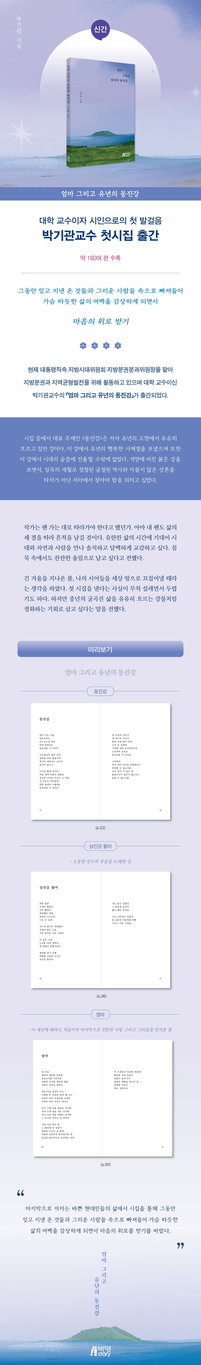 저자:박기관 「현대계간문학(2017)」<동진강>으로신인문학상을수상하며등단했다. 현재상지대학교에서행정학을가르치고있다.대학교수로서여러공공기관과기업체에초청받아강연하던중,강연에서공개한자작시가좋은반응을얻어시집을출간하기에이르렀다.그의전공과목이주는딱딱한느낌과는달리,박기관의시는부드러운색채로가득하다.그가세상을향해내뿜는시어는읽는이의마음에따뜻한울림을주고그리운감성을깨운다. 주요저서로는『지방의회도인사청문회를한다(2023)』,『문화행정의이해(2015)』,『한국지방정치행정론(2015)』등이있다.