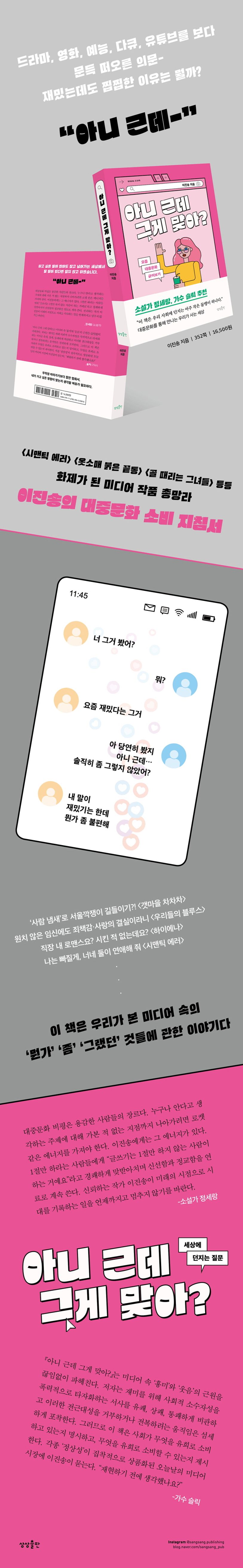 〈시맨틱 에러〉 〈옷소매 붉은 끝동〉 〈문명특급〉 〈골 때리는 그녀들〉…, 재밌는 작품들을 통해 사회의 현상을 이해할 수 있다면 일석이조가 따로 없다. 정답지보다는 해설지에 가까운, 요즘 세상에 필요한 강단 있는 책 『아니 근데 그게 맞아?』를 만나보기를 바란다.