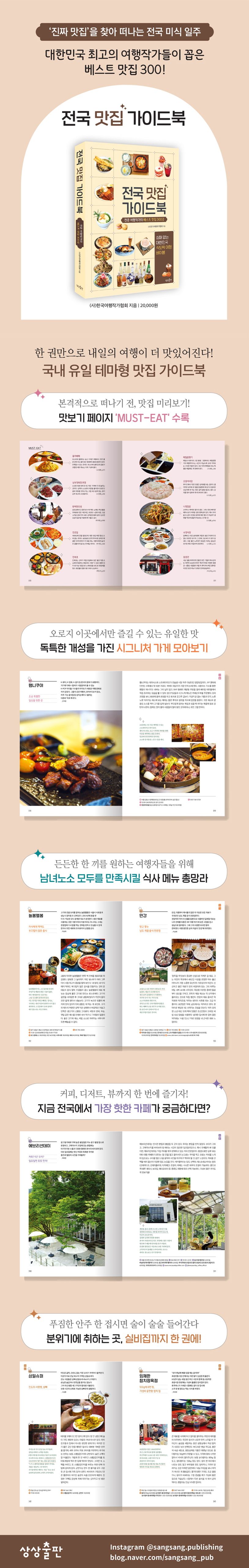 맛집에 대한 관심도가 전반적으로 상승하며 그에 따라 불필요한 정보들이 함께 늘어난 지금, 신뢰할 만한 맛집 정보를 눌러 담은 『전국 맛집 가이드북』 한 권으로 전국의 모든 맛집을 알아보고 맛있는 여행을 계획해 보자.