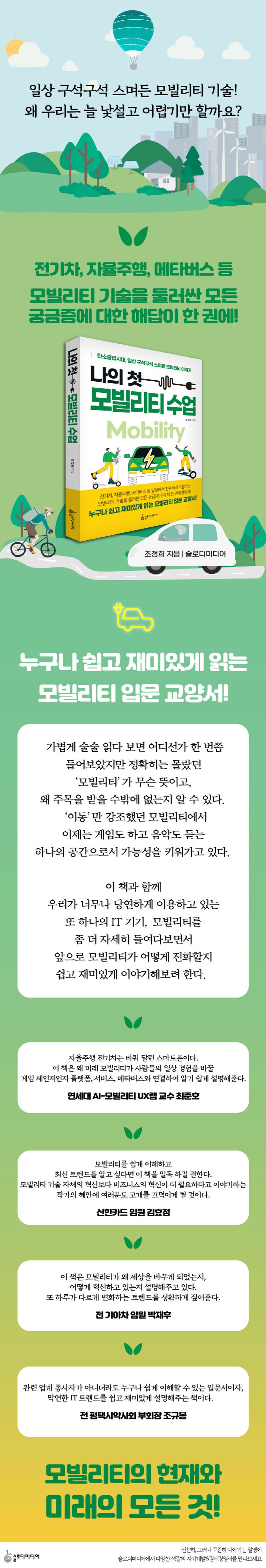 이 책과 함께 우리가 너무나 당연하게 이용하고 있는 또 하나의 IT 기기, 모빌리티를 좀 더 자세히 들여다보면서 앞으로 모빌리티가 어떻게 진화할지 쉽고 재미있게 이야기해보려 한다.