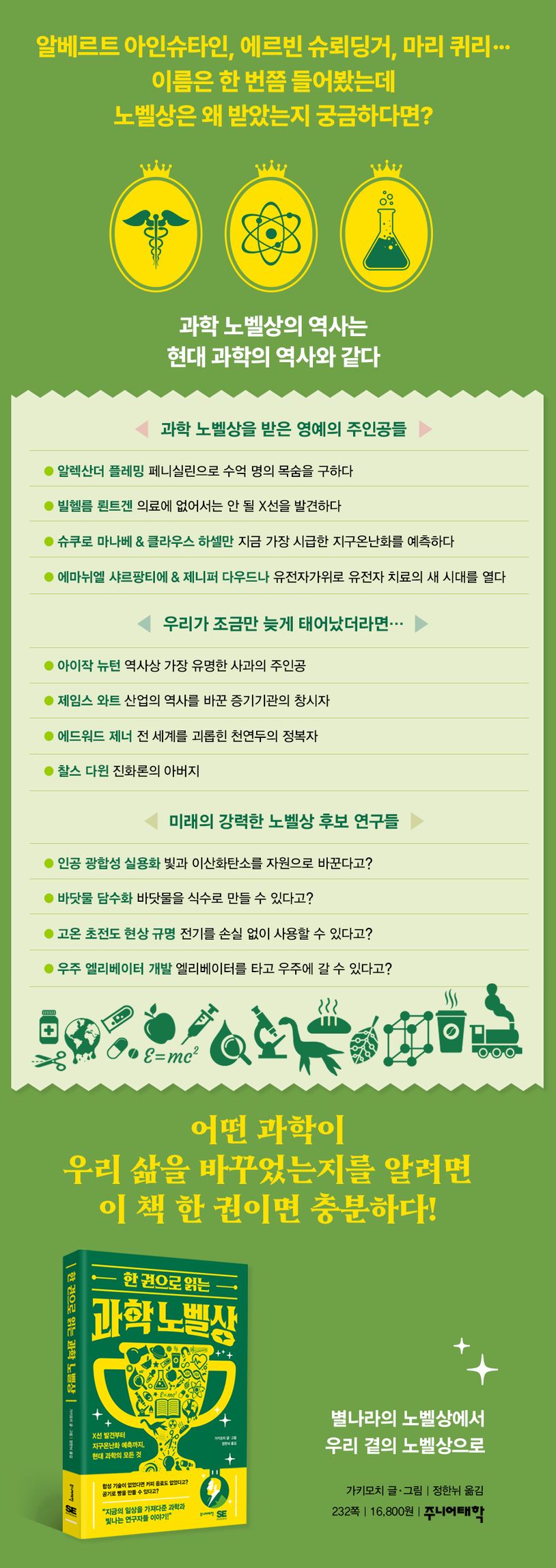 아인슈타인, 슈뢰딩거, 퀴리 부부… 누구나 한 번쯤은 들어봤을, 과학 노벨상을 빛낸 인물들이다. 이 책은 현대 과학에서 빼놓을 수 없는 노벨상 수상 연구자들과 그들의 발견 및 발명을 쉽고 풍부한 도판과 박스글로 하나하나 소개하고, 만약 노벨상이 있었다면 상을 받았을 과거의 과학과 강력한 노벨상 후보인 미래의 과학까지 아우른다. 이 책과 함께라면 노벨상이 더는 멀고 어렵게만 느껴지지 않고 우리의 삶을 한 단계 끌어올린, 한층 가깝고 고마운 대상으로 다가올 것이다.