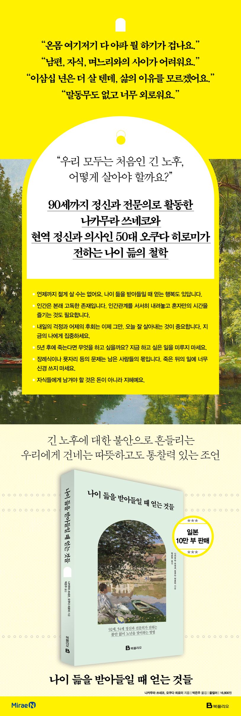 이러한 고민을 누구보다 잘 아는 두 사람이 만났습니다. 70년간 정신과 전문의로 활동한 아흔두 살의 나카무라 쓰네코 선생님과 나카무라 선생님으로 인해 정신과로 진료 분야를 바꾼, 왕성하게 활동 중인 쉰네 살의 현역 정신과 전문의 오쿠다 히로미입니다. 일적으로도 삶적으로도 선배이자 후배로 깊은 교감을 나누는 두 사람은, 이 풍요의 시대에 많은 사람이 나이 드는 것을 불안해한다는 것에 주목하고 필요한 조언을 대화 형식으로 한 권의 책에 담았습니다.