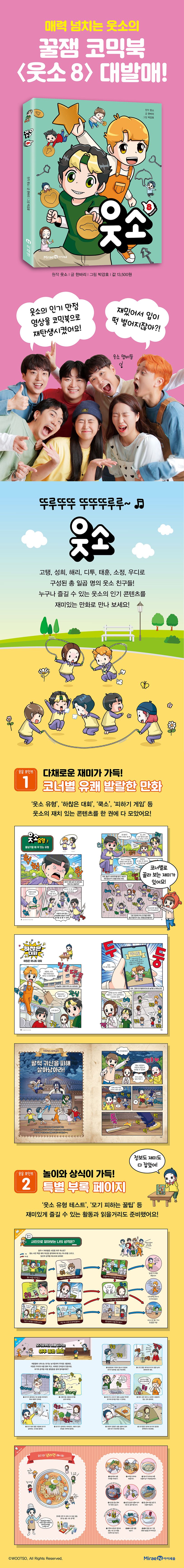 ‘줄넘기 할 때 꼭 있는 유형’, ‘하찮은 마니토 대회’, ‘팔척 귀신 피하기’ 등 웃소의 인기 영상 콘텐츠를 엄선하여 만화로 재탄생시켰습니다. 웃소 멤버들의 매력을 살린 귀여운 캐릭터와 코믹한 에피소드들이 만나 여러분을 웃음 짓게 합니다. 웃음을 빵빵 터트리게 하는 《웃소 8》을 지금 당장 만나 보세요!