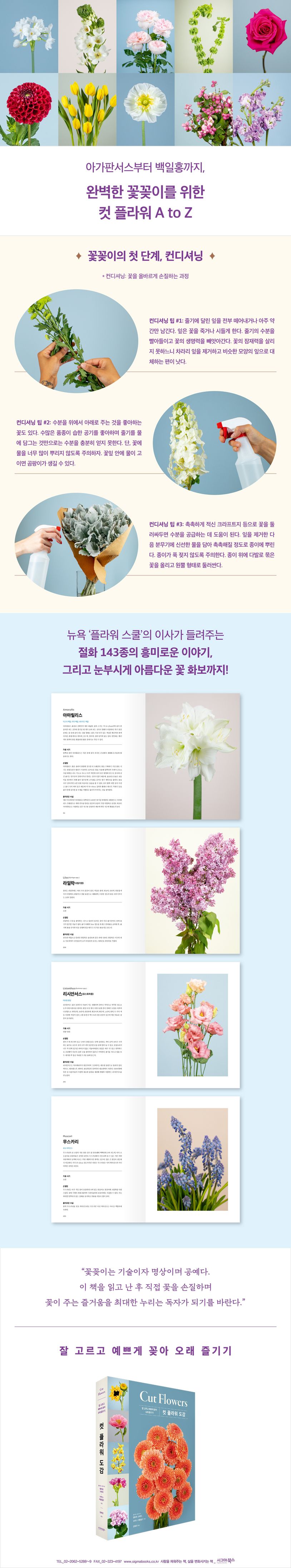 『컷 플라워 도감』은 쉽게 구할 수 있는 꽃 143종을 ‘플라워 스쿨’의 이사 캘버트 크레리가 직접 찍은 훌륭한 이미지와 함께 수록한 책이다. 소개하는 꽃 각각에는 집에서 꽃을 다룰 때 믿고 따를 만한 팁뿐만 아니라 꽃의 통칭과 학명, 구매하기 가장 적합한 시기, 꽃에 얽힌 흥미로운 사실 등을 담았다.