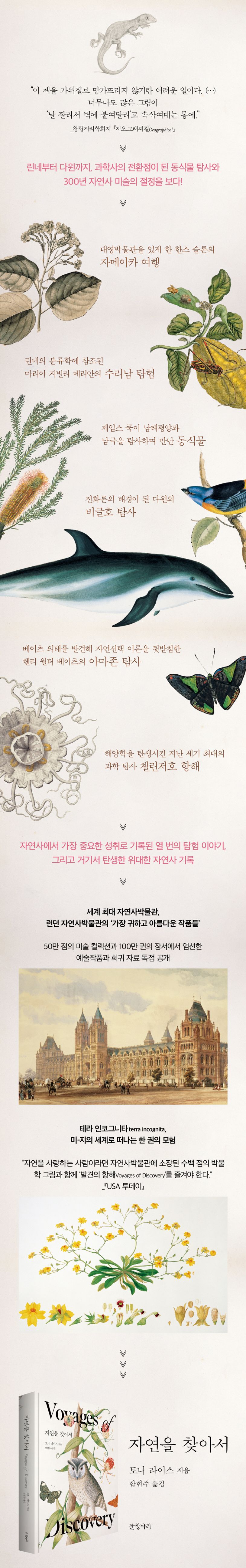 『자연을 찾아서』는 17~20세기 자연사에서 가장 중요한 성취로 기록된 열 번의 탐험과 거기서 탄생한 위대한 예술작품들을 소개한다. 런던 자연사박물관에 소장된 50만 점의 미술 컬렉션과 100만 권의 장서에서 엄선한 예술작품과 희귀 자료를 독점적으로 실은 이 책은 자연사의 보고이자, 인간의 성취가 만난 아름다운 자연 그 자체다. 이름난 과학자, 탐험가, 박물학자의 위대한 발견 뒤에는 그들만큼이나 위험을 불사하며 모험을 감행했던 알려지지 않은 예술가들의 헌신이 있었다. 대영박물관을 있게 한 한스 슬론의 자메이카 여행부터 진화론의 배경이 된 다윈의 비글호 탐사, 해양학을 탄생시킨 지난 세기 최대의 과학 탐사 챌린저호 항해까지 자연과학의 분수령이 된 탐험들이 당대의 그림과 사진으로 고스란히 담긴 이 책은, 처음 만나는 자연의 경이를 우리 눈앞에 생생히 펼쳐놓는다.