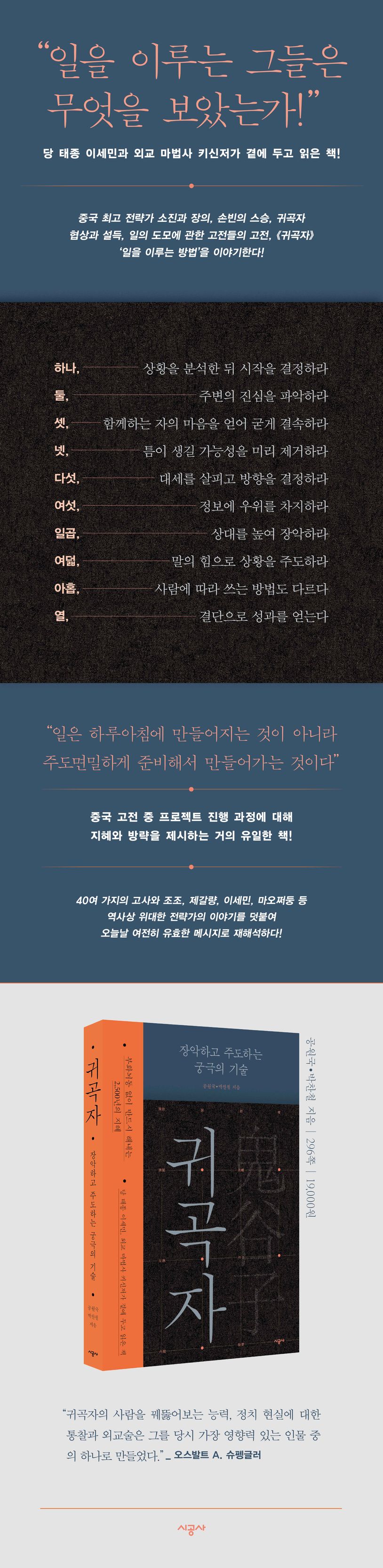 중국 전문가인 두 저자가 중국의 40여 가지 고사와 조조, 제갈량, 이세민 등 역사상 위대한 전략가들이 일을 이루기 위해 사용했던 전략을 덧붙여 전국시대 전략서인 《귀곡자》를 풀이하고 현대에도 활용할 수 있는 메시지로 재해석했다. 이 책은 일을 정확하게 정의하고, 주변의 객관적 상황을 파악하며, 형세를 살피고, 같이 일할 사람과 네트워크를 구축하는 방식 등을 이야기함으로써 일의 시작부터 준비, 진행, 문제 해결, 결단, 일을 잘 마무리하는 방법을 소개한다.