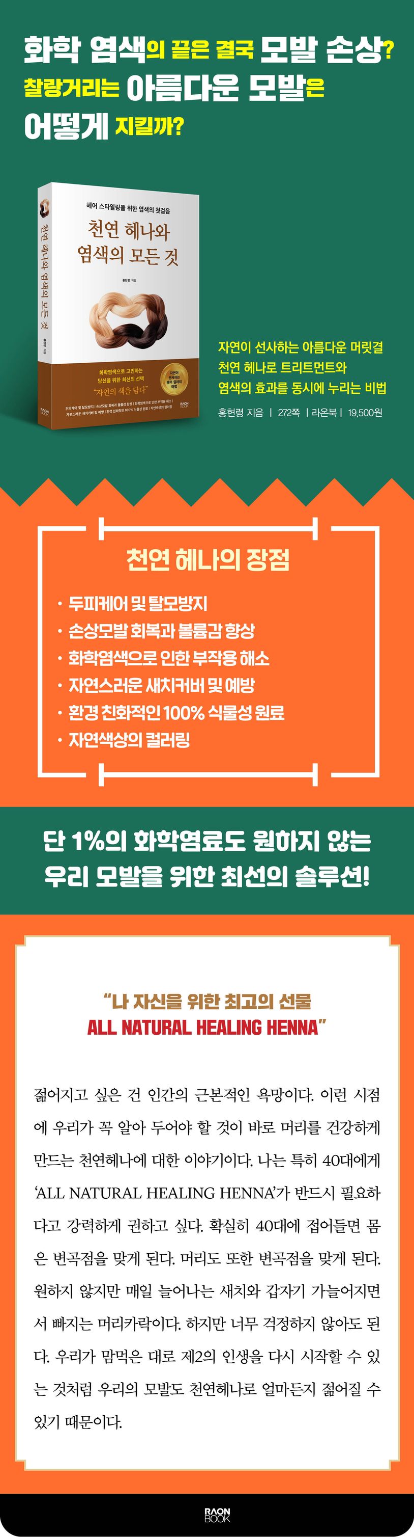 젊어지고 싶은 건 인간의 근본적인 욕망이다. 이런 시점에 우리가 꼭 알아 두어야 할 것이 바로 머리를 건강하게 만드는 천연헤나에 대한 이야기이다. 40대에 접어들면 우리 모발도 변곡점을 맞게 된다. 원하지 않지만 매일 늘어나는 새치와 갑자기 가늘어지면서 빠지는 머리카락이 바로 그 징후이다. 하지만 너무 걱정하지 않아도 된다. 우리가 맘먹은 대로 제2의 인생을 다시 시작할 수 있는 것처럼 우리의 모발도 천연헤나로 얼마든지 젊어질 수 있기 때문이다. 마음은 자기계발서 등을 읽는 등 독서와 학습을 통해 젊게 유지할 수 있다. 피부 주름은 첨단기술로 개발되는 천연원료 등을 바르거나 의학의 도움으로 펼 수 있다. 근육은 꾸준한 운동을 통해 탄탄하게 만들 수 있다. 하지만 두피와 머리카락은 천연헤나로만 젊고 건강하고 굵게 유지할 수 있다. 이 책에서는 지금 현대인들의 모발 고민과 이유 등을 점검해 보고 천연헤나의 힘이 어떻게 모발 고민을 해결하는지 원리에 대해 자세히 소개한다. 이와 더불어 어떻게 사용하면 천연의 힘으로 두피부터 모발 끝까지 젊어질 수 있는지 천연헤나의 비법을 공개했다. 독자 여러분 모두 천연헤나의 힘을 이용해 제2의 인생을 파워풀하고 활기차게 꾸미는 데 많은 도움이 되길 바란다.