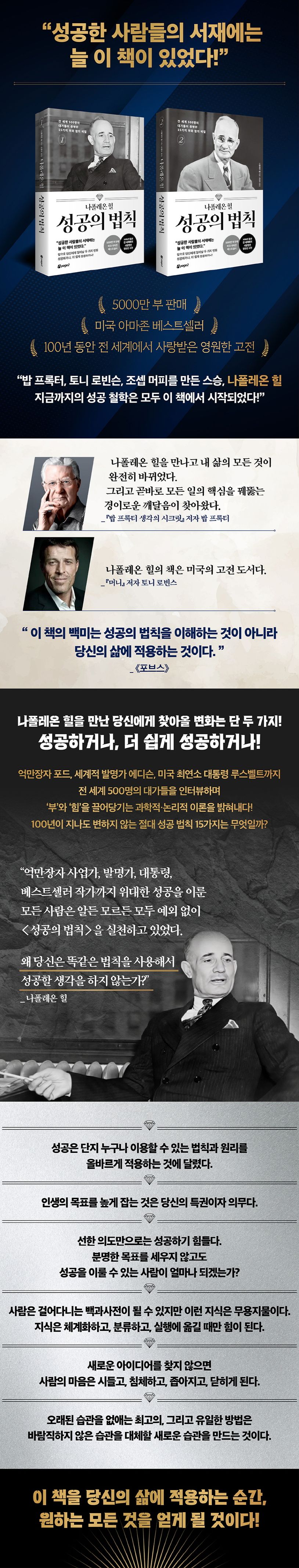 나폴레온 힐은 100년 전, ‘성공한 사람들의 공통점’을 분석하고 이를 체계적으로 정리한 원칙들을 세상에 알린 최초의 인물이다. 그가 정립한 ‘성공의 법칙’ 15가지는 100년이 지난 지금에도 변하지 않는 절대법칙으로 이어져 내려오고 있다. 그의 막강한 영향력은 몇몇 후계자들을 통해 여실히 느낄 수 있다.