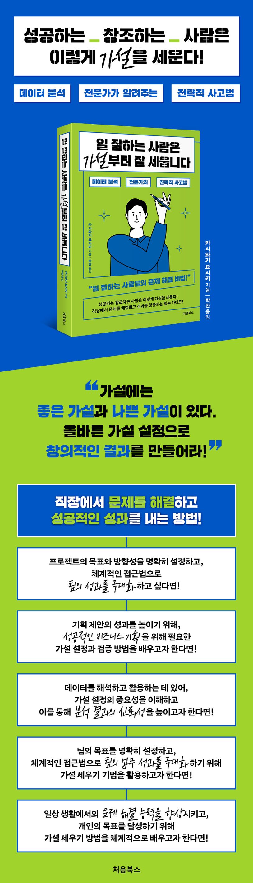 《일 잘하는 사람은 가설부터 잘 세웁니다》는 일상과 직장 생활에서 더 나은 결정을 내리기 위한 '가설 세우기'의 중요성을 다루는 책입니다. 저자는 '그냥 무턱대고 일하는 것'과 '좋은 가설을 세우고 일하는 것'에는 큰 차이가 있다고 설명합니다. 저자는 경영, 영업, 마케팅 등 다양한 분야의 실무를 직접 체험하고 연구하며 효과적인 가설 설정이 프로젝트의 성패를 좌우한다는 것을 발견했습니다. 그래서 저자는 가설을 '운영 체제'에 비유합니다. 여러 데이터 분석이나 방법 등이 효과적인 가설 위에서 작동해야 한다고 강조합니다.