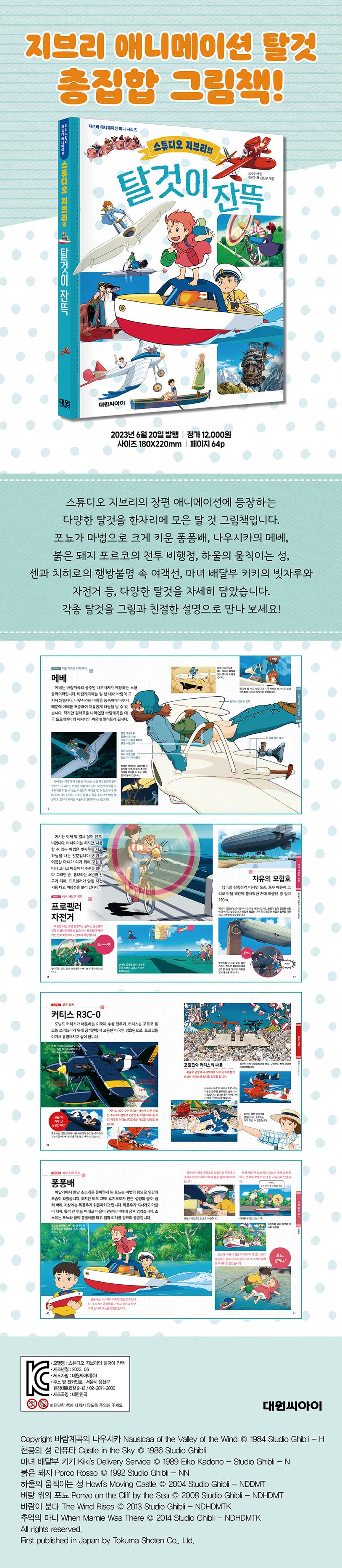 스튜디오 지브리의 장편 애니메이션에 등장하는 다양한 탈것을 한자리에 모은 탈 것 그림책입니다. 포뇨가 마법으로 크게 키운 퐁퐁배, 나우시카의 메베, 붉은 돼지 포르코의 전투 비행정, 하울의 움직이는 성, 센과 치히로의 행방불명 속 여객선 등, 다양한 탈것을 자세히 담았습니다.