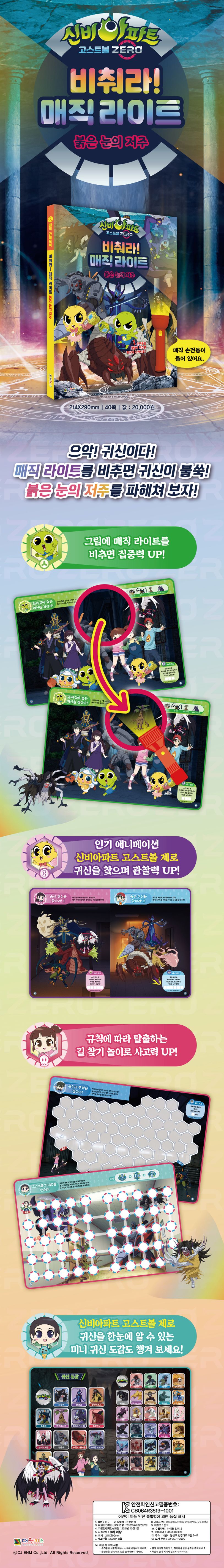 ≪신비아파트 고스트볼 제로 비춰라! 매직 라이트 붉은 눈의 저주≫는 동봉된 LED 손전등 불빛을 비춰 숨은 귀신을 찾고 미로를 탈출하는 체험형 숨은 그림 찾기 게임북입니다. 이 책은 어린이들에게 집중력, 관찰력과 상상력을 자극하는 재미를 선사할 예정입니다.