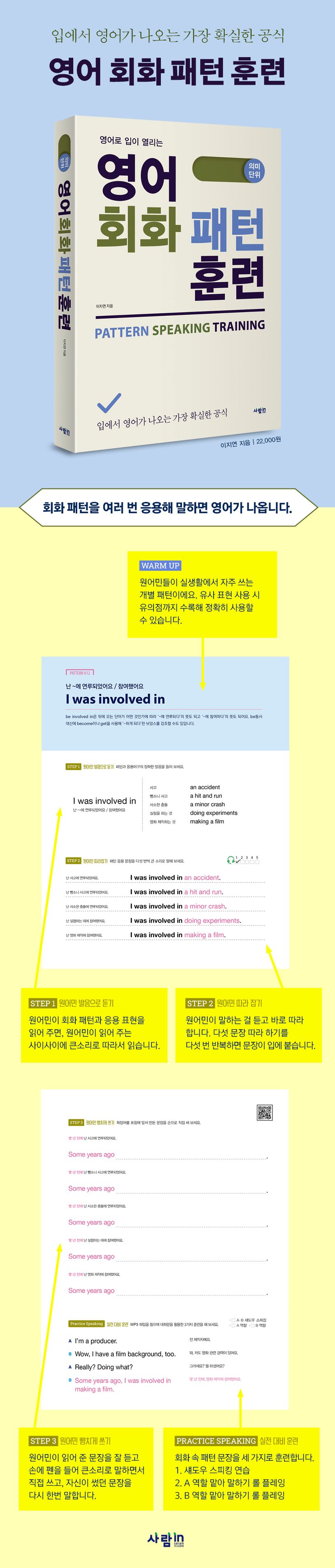『영어 회화 패턴 훈련』은 원어민들이 일상생활에서 자주 쓰는 주요 회화 패턴들을 선별한 영어 말하기 집중 훈련서이다. 영어를 모국어로 하는 원어민들은 개별 단어를 일일이 조합하는 대신, 기본이 되는 회화 패턴에 다양한 표현을 더해 수천, 수만 개의 문장을 만든다. 그래서 많은 어학 전문가들은 비영어권 화자들이 영어 말문을 트는 데 가장 효과적인 방법으로 패턴 학습을 꼽는다. 『영어 회화 패턴 훈련』은 체계적인 반복 학습 프로세스와 QR 코드로 제공되는 패턴 훈련 트레이닝 음원으로 영어 패턴 훈련을 질리지 않고 끝까지 할 수 있게 한다.