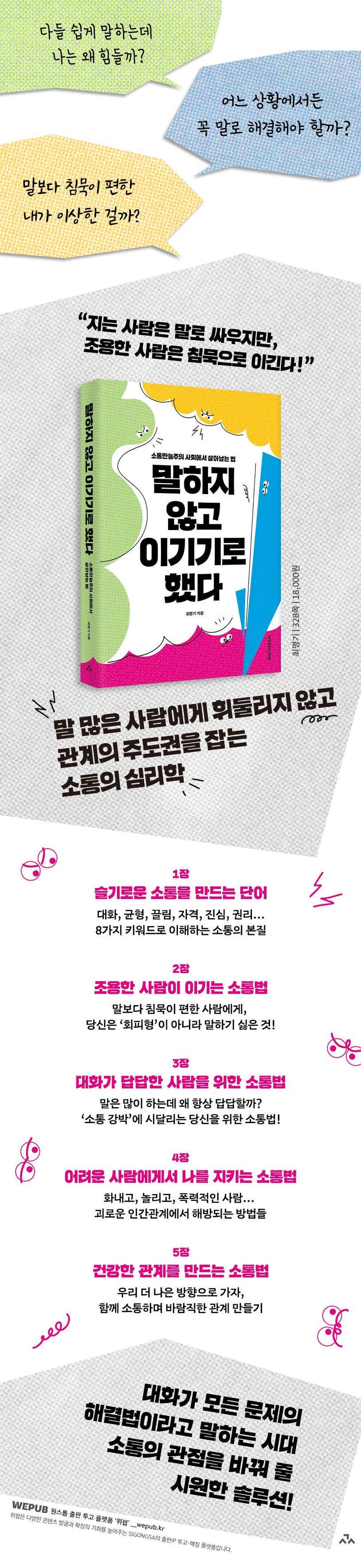 다년간의 심리 상담은 물론, 방송과 글을 통해 수많은 사람들의 고민을 가까이서 마주해온 저자는 도덕적 조언이 아닌 지금 당장 쓸 수 있는 소통의 전략을 제시한다. 1장에서는 소통을 이해하는 8가지 키워드로 살펴보고, 2장에서는 조용한 사람들을 위한 소통법을, 3장에서는 대화가 답답한 사람들을 위한 소통법을 소개한다. 4장은 해로운 인간관계에서 나를 보호하는 방법을 담고 있으며, 5장은 관계를 지켜내는 데 필요한 소통의 태도와 실천을 전한다.