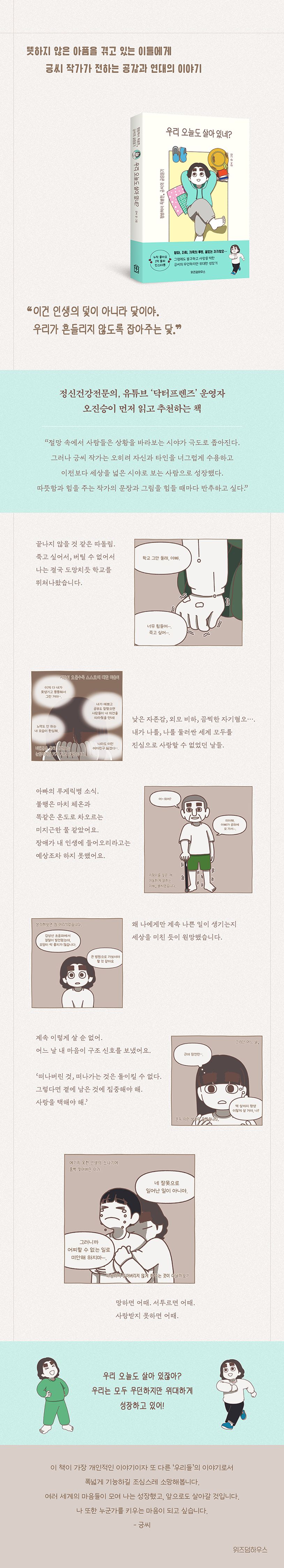 갑작스러운 아버지의 루게릭병 투병으로 찾아온 변화를 인스타그램에 연재하며 폭발적인 공감과 지지를 받은 ‘긍씨의 글림일기’ 첫 번째 단행본이 출간됐다. 작가는 아버지 ‘별씨’와의 기억이 훗날 흐릿해지는 것이 두려워 글과 만화로 일상을 기록하기 시작했지만, 아버지의 투병을 지켜보며 깨달은 가족의 소중함, 자기 자신을 아끼고 사랑하는 방법, 더 나아가 타인과 세계를 포용하게 되는 성장담으로 이야기를 점점 확장시켜 나갔다. 긍씨 작가의 덤덤한 성장담은 비슷한 가족의 아픔을 겪고 있는 독자들, 오늘도 나만 불행하다는 생각으로 하루를 보낸 독자들에게 사랑과 공감의 에너지를 선사하며 극찬을 받고 있다. 가장 개인적인 이야기이자 또다른 ‘우리들’의 이야기, 『우리 오늘도 살아 있네?』는 첫 번째 단행본을 기념하고자 인스타그램 연재 버전과는 다른 그림체로 특별하게 구성했으며 긍씨 작가의 에세이를 새롭게 공개하여 소장 가치를 높였다..