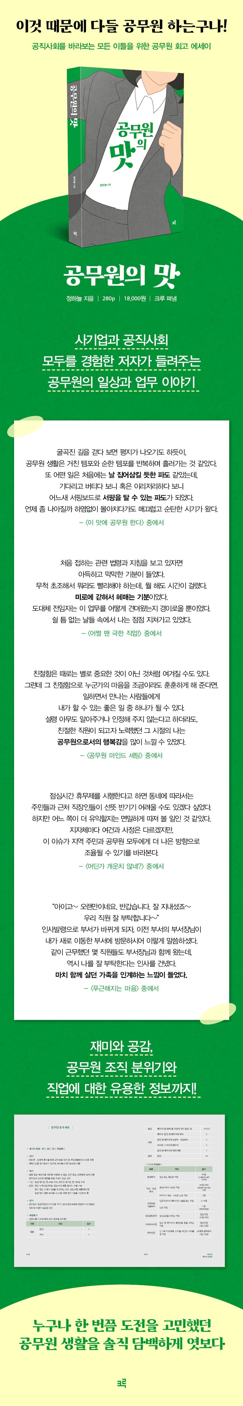 『공무원의 맛』은 9급 행정공무원으로 공직사회에 입문한 저자가 승진을 거듭하며 일하는 동안 경험했던 내용을 에세이로 풀어낸 책이다. 공무원의 표면적인 장단점뿐만 아니라 실제 조직 내 분위기는 어떠한지, 공무원의 다양한 업무현장은 어떤 모습인지, 같이 일하는 사람들과의 관계, 그리고 개인적으로 활용해 봄직한 여러 가지 제도 등도 함께 정리했다. 진지하게 공무원이 되고자 고민하면서도 여러 정보에 혼란스러운 독자들에게 객관적인 가이드를 줄 수 있을 것이다.