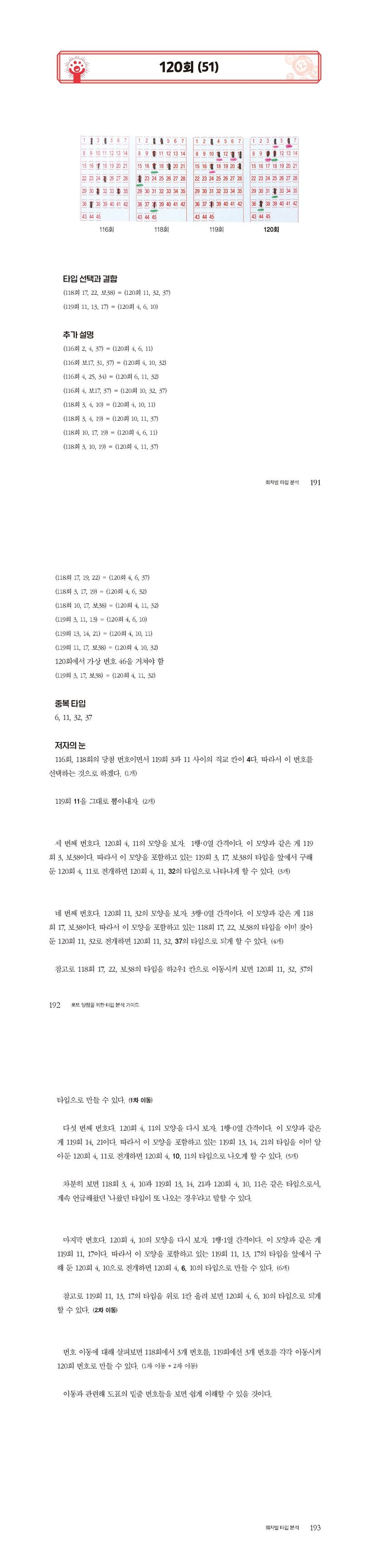 전작인 〈로또 당첨의 이론과 실제〉가 심화된 내용을 다뤘다면 〈로또 당첨을 위한 타입 분석 가이드〉는 더 직관적이고 대중적인 방향으로 책을 구성하였다. 우선 분석을 위해 수록한 70회 분량의 로또 회차에 모두 도표를 삽입해 이해를 돕고 있다. 또한 로또의 기본 개념을 요약하고 설명하는 데 이어 저자가 고안해 낸 ‘타입’이라는 개체를 통해 기존 소스 회차들로부터 추첨 회차의 당첨 번호를 만드는 방법을 안내한다. 행운은 예기치 못하게 찾아오지만, 그 행운을 붙잡는 것은 노력과 역량이라고들 말한다. 이 책이 로또 당첨의 안내서로서 행복과 행운을 붙잡는 데 작게나마 일조하기를 소망한다.
