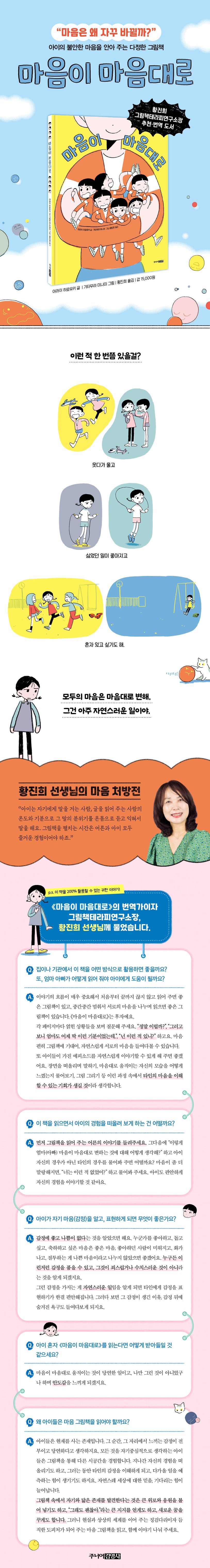 《마음이 마음대로》는 이렇듯 계속해서 변하는 심리가 자연스러운 일이라는 것을, 쌍둥이 남매와 부모님의 이야기를 통해 쉽게 이해하도록 구성한 그림책입니다. 아이들의 불안한 마음을 보듬어 자신의 감정을 잘 들여다볼 수 있게, 더 넓게는 타인의 마음을 이해할 줄 아는 사람으로 자라게 도와줄 거예요.
