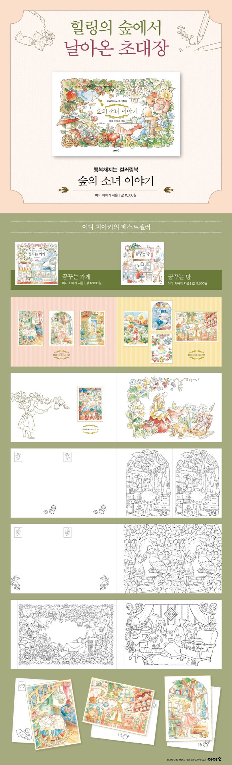 숲속에 작은 요정 소녀가 살고 있습니다. 봄이 오면 꽃이 만발한 터널을 산책하고, 딸기와 블루베리로 새콤달콤한 잼을 만듭니다. 햇살이 가득 퍼지는 나무 집 거실에서 매일 오후 행복한 티타임을 즐깁니다. 가을에는 통통하게 무르익은 과일이며 버섯을 따느라 시간을 잊습니다. 일본의 유명 일러스트레이터 이다 치아키가 만든 세 번째 컬러링북 《숲의 소녀 이야기》에는 평화로운 숲속 일상이 가득합니다. 책장을 넘기면 피톤치드가 솔솔, 풍요로운 자연이 시야 가득 펼쳐집니다. 한 장 한 장 색칠하는 동안 소녀는 근심과 어두웠던 마음을 어느 틈에 슬쩍 거둬가고, 편안함으로 가득 채워놓습니다.